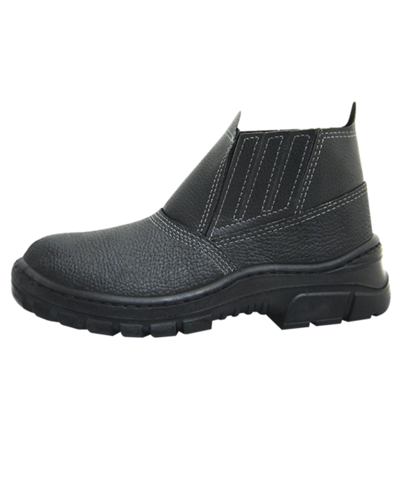 Calçado ocupacional tipo botina, confeccionado em couro curtido ao cromo, fechamento em elástico, palmilha de montagem em não tecido, solado em poliuretano monodensidade, sem bico de aço.